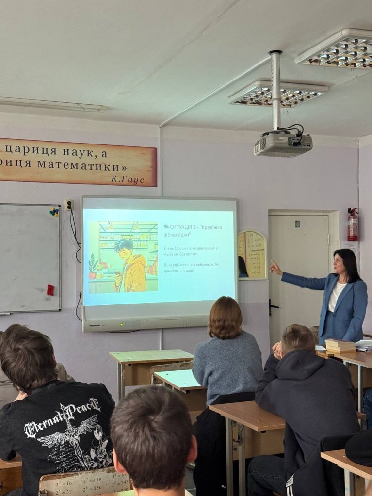 Під час уроку учні ознайомилися з видами юридичної відповідальності, віковими межами настання відповідальності, а також розібрали приклади правопорушень, які найчастіше трапляються серед підлітків: булінг, поширення фото без згоди, дрібна крадіжка, розпивання алкоголю, керування транспортом без документів та прав тощо.
